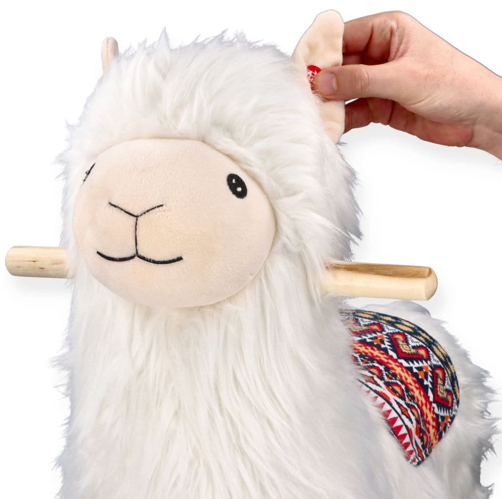 Alpaka wykonana jest z miękkiego pluszu i poliestru, a stabilną bazę stanowią drewniane płozy oraz metalowy stelaż, co zapewnia trwałość i bezpieczeństwo zabawy.