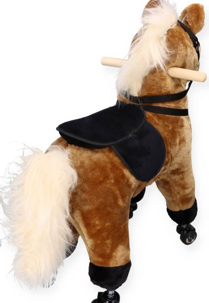 Konik wykonany jest z miękkiego pluszu, a jego konstrukcja opiera się na metalu, drewnie oraz solidnych gumowych kołach.