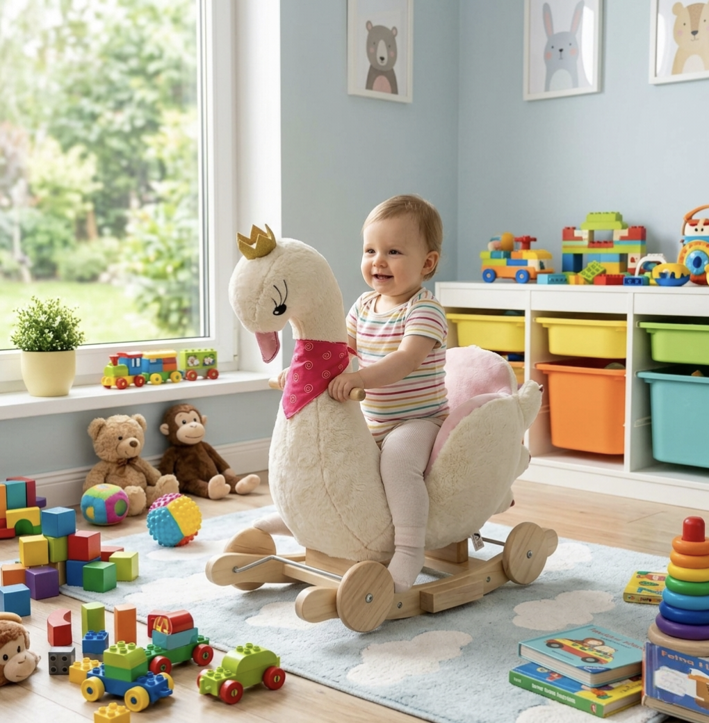 Poznaj wyjątkową Królową Łabędzi – elegancki i niezwykle miękki bujaczek 2w1 z wygodnym fotelikiem, pasami oraz kołami.
