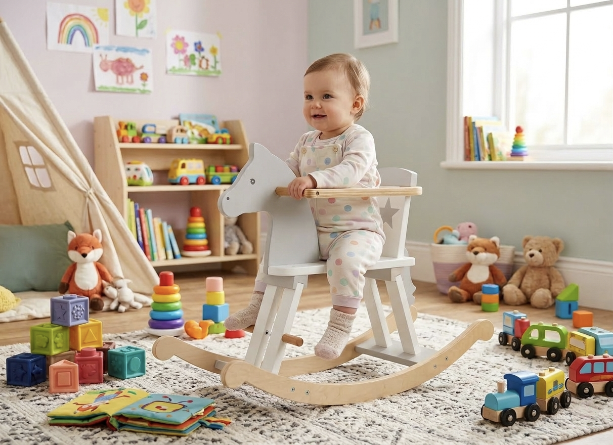 Drewniany konik na biegunach z barierkami – bezpieczny bujak 1+
