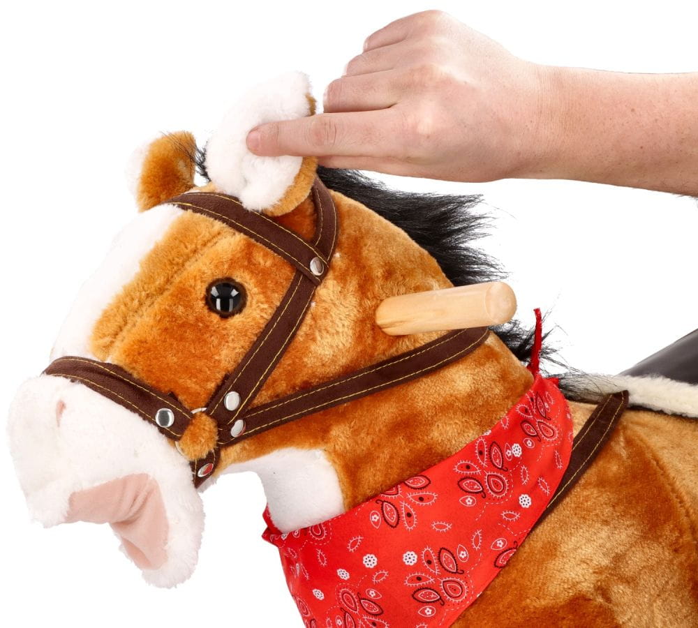 Po naciśnięciu jednego ucha konik rży, po naciśnięciu drugiego galopuje i rży. Dodatkowo rusza przy tym pyszczkiem i ogonkiem.