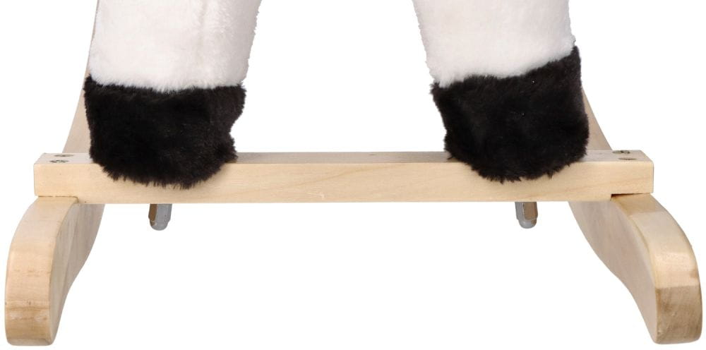 Zabawka wykonana jest z miękkiego pluszu, posiada drewniane płozy oraz solidną metalową konstrukcję wewnętrzną.