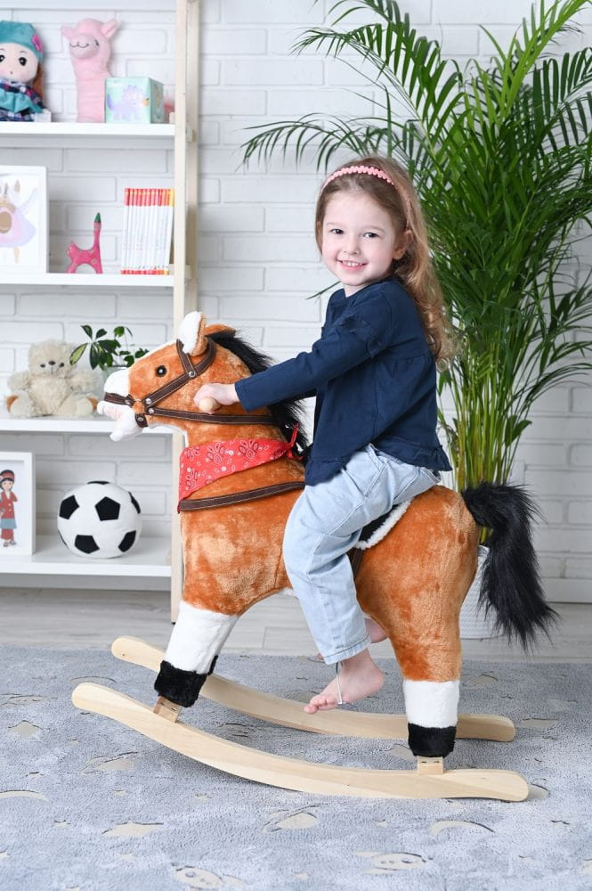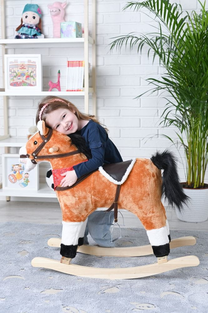 Gniady kolor z jasnymi wstawkami nadaje konikowi eleganckiego wyglądu, co sprawia, że staje się nie tylko przedmiotem zabawy, ale także stylowym elementem wnętrza.