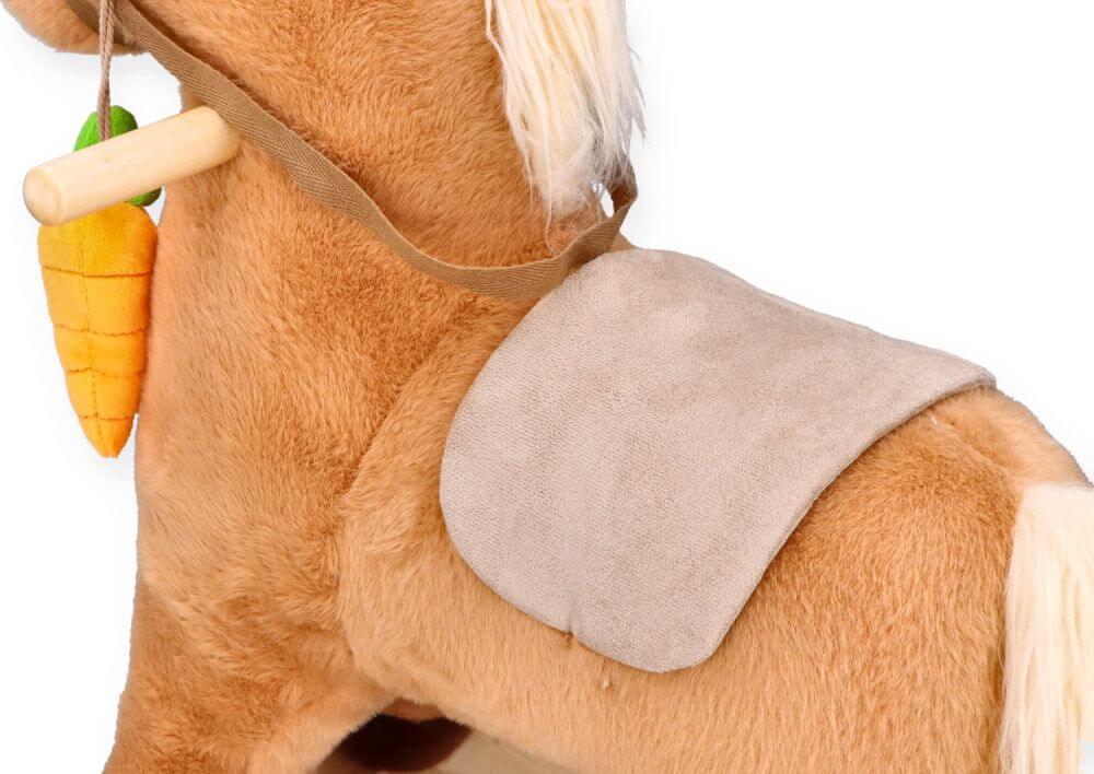 Konik wykonany jest z miękkiego pluszu, a jego konstrukcja opiera się na metalu i drewnie, co zapewnia trwałość i komfort użytkowania.