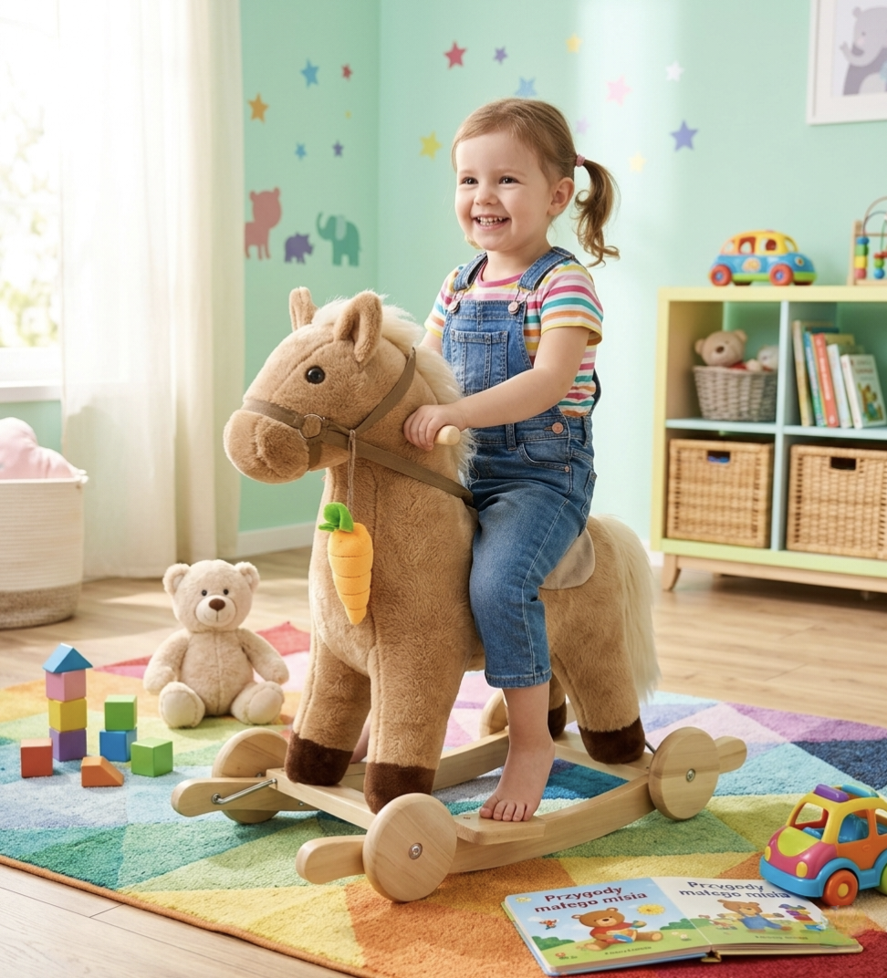 Wyróżnia się mięciutkim futerkiem, dopracowanymi detalami i funkcją 2w1 – dziecko może się bujać lub jeździć.