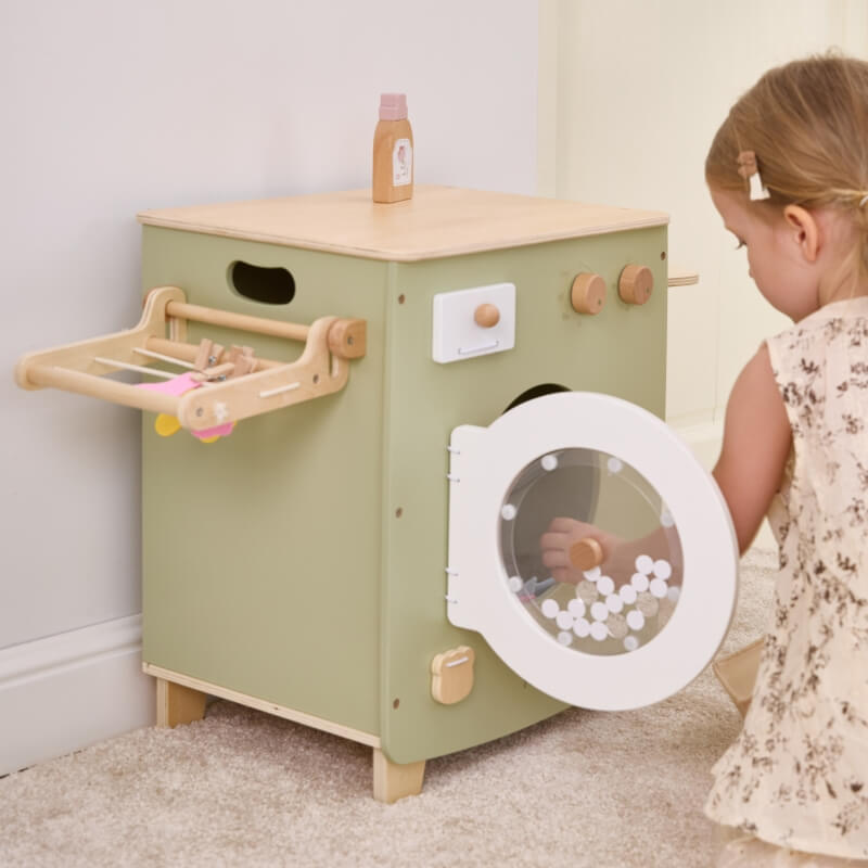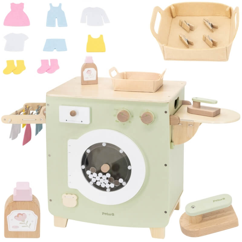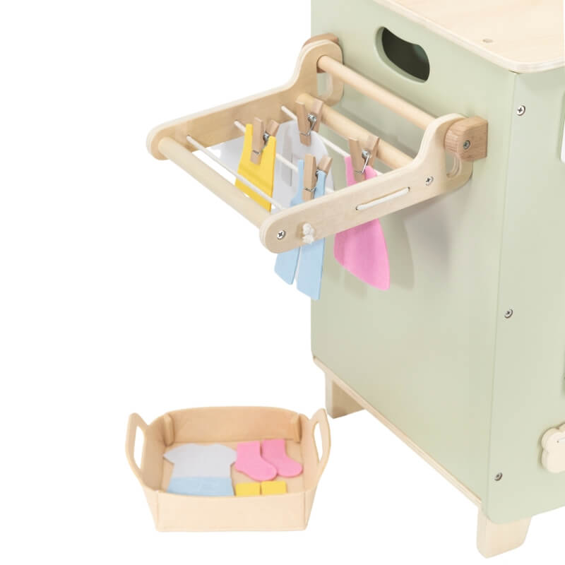 ✅ Rozkładana suszarka – dzieci mogą także rozwieszać „uprane" ubrania na rozkładanej suszarce, co wzbogaca zabawę i uczy odpowiedzialności.