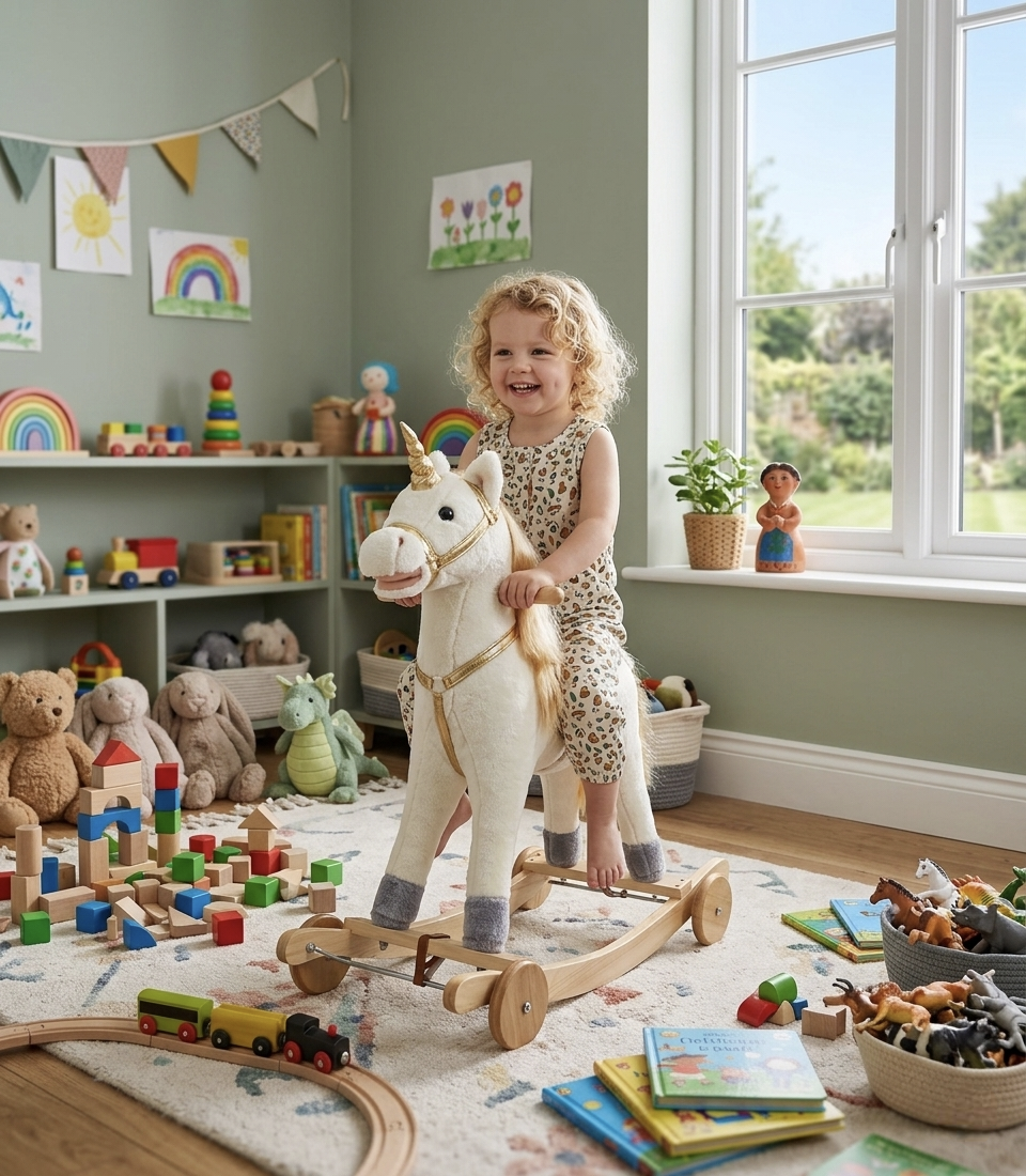 Złoto biały kolor nadaje konikowi eleganckiego i klasycznego wyglądu, co sprawia, że staje się nie tylko przedmiotem zabawy, ale także stylowym elementem wnętrza.